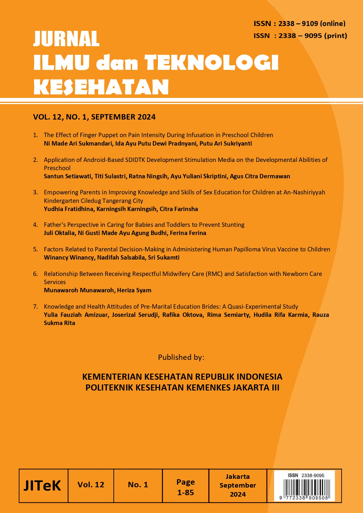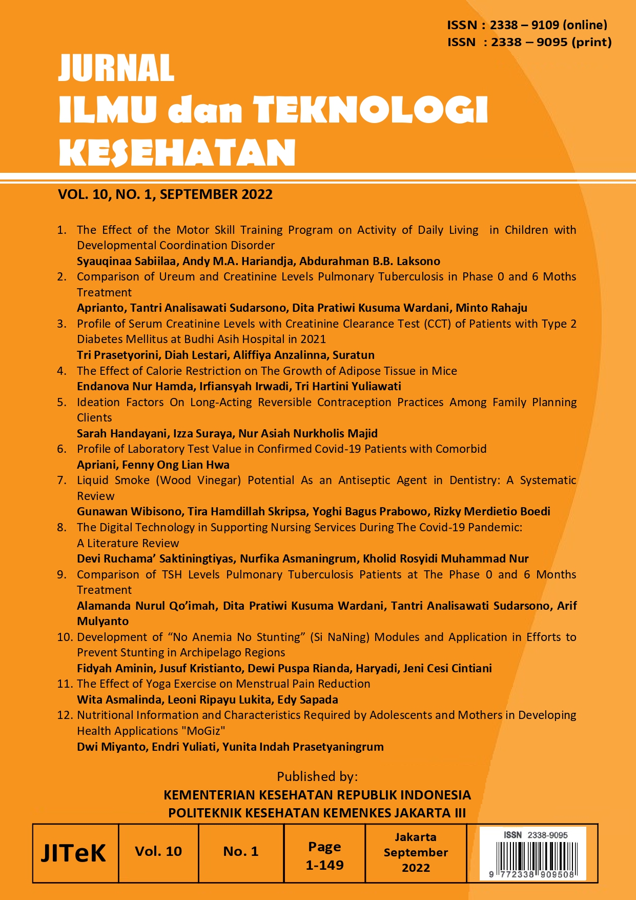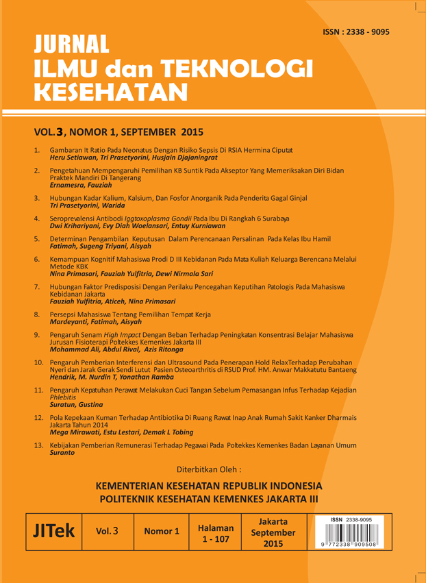 Jurnal Ilmu dan Teknologi Kesehatan (JITeK) Vol. 1 Nomor 1 tahun 2013 terbit dengan beberapa catatan. Jurnal ini merupakan perbaikan dari Jurnal Madya yang telah terbit sejak tahun 2001. Disamping adanya pergantian nama menjadi lebih spesifik dari Jurnal Madya ke Jurnal Ilmu dan Teknologi Kesehatan, juga ada perubahan lainnya yaitu waktu terbit, JITeK akan terbit setiap bulan September dan Maret. Untuk meningkatkan kualitas, jurnal ini juga akan memuat artikel yang dikirim oleh penulis dari instansi lain, sesuai dengan ketentuan yang berlaku di JITeK. JITeK terbitan pertama ini masih memuat 100% artikel hasil penelitian dosen Poltekkes Kemenkes Jakarta III. Lima buah artikel membahas tentang kebidanan, meliputi Kesehatan Reproduksi Wanita; Taksiran Berat Badan Janin Dibandingkan dengan Berat Badan Bayi Baru Lahir; dan Kejadian Abertus Imminens. Dua artikel mengenai Kualitas Makanan/Bumbu. Tiga artikel lainnya adalah mengenai Penghitungan Manual Nilai Base Excess pada Asidosis; Persepsi Tentang Kekerasan Pada Anak; dan tentang Kinerja Bidan Pembina Wilayah Puskesmas; satu artikel mengenai Soft Skill yang Dibutuhkan dalam Dunia Kerja serta artikel mengenai Pengaruh Pemberian Stimulasi Sensomotor Terhadap Tingkat Arousal dan Atensi Anak Normal Usia 6-8 Tahun. Pada kesempatan ini penyunting berharap artikel yang disajikan sesuai dengan kebutuhan pembaca, terimakasih.