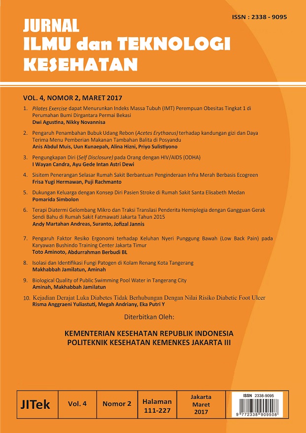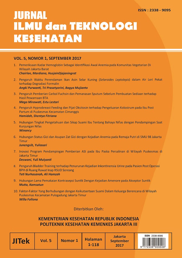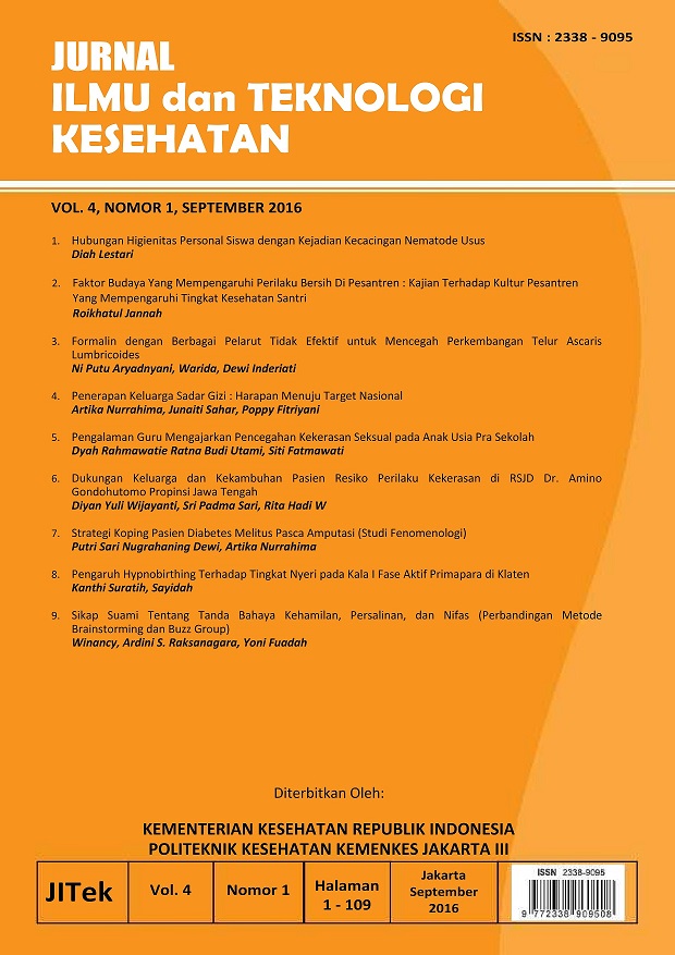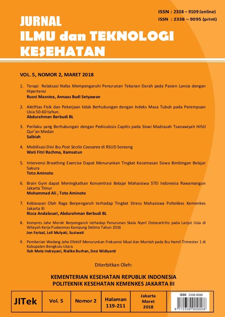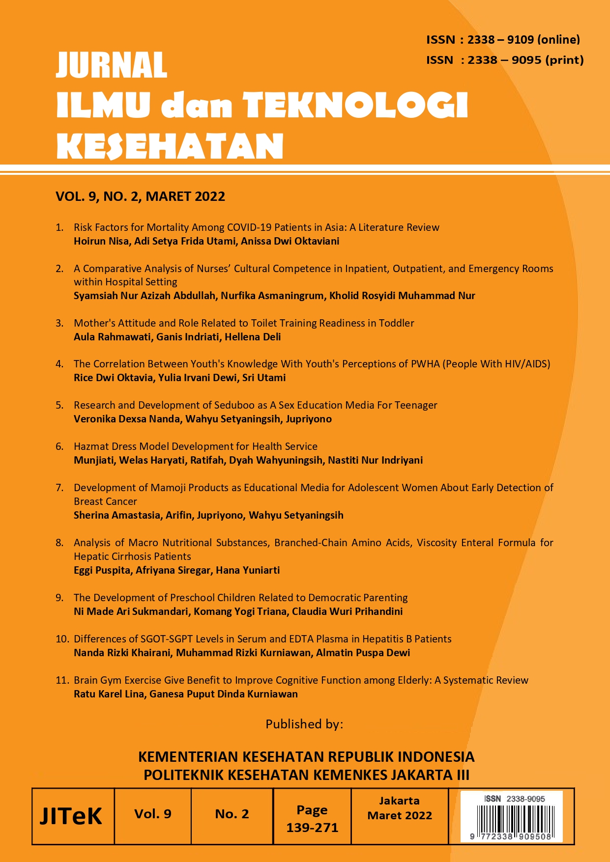 Jurnal Ilmu dan Teknologi Kesehatan (JITeK) Vol. 1 Nomor 1 tahun 2013 terbit dengan beberapa catatan. Jurnal ini merupakan perbaikan dari Jurnal Madya yang telah terbit sejak tahun 2001. Disamping adanya pergantian nama menjadi lebih spesifik dari Jurnal Madya ke Jurnal Ilmu dan Teknologi Kesehatan, juga ada perubahan lainnya yaitu waktu terbit, JITeK akan terbit setiap bulan September dan Maret. Untuk meningkatkan kualitas, jurnal ini juga akan memuat artikel yang dikirim oleh penulis dari instansi lain, sesuai dengan ketentuan yang berlaku di JITeK. JITeK terbitan pertama ini masih memuat 100% artikel hasil penelitian dosen Poltekkes Kemenkes Jakarta III. Lima buah artikel membahas tentang kebidanan, meliputi Kesehatan Reproduksi Wanita; Taksiran Berat Badan Janin Dibandingkan dengan Berat Badan Bayi Baru Lahir; dan Kejadian Abertus Imminens. Dua artikel mengenai Kualitas Makanan/Bumbu. Tiga artikel lainnya adalah mengenai Penghitungan Manual Nilai Base Excess pada Asidosis; Persepsi Tentang Kekerasan Pada Anak; dan tentang Kinerja Bidan Pembina Wilayah Puskesmas; satu artikel mengenai Soft Skill yang Dibutuhkan dalam Dunia Kerja serta artikel mengenai Pengaruh Pemberian Stimulasi Sensomotor Terhadap Tingkat Arousal dan Atensi Anak Normal Usia 6-8 Tahun. Pada kesempatan ini penyunting berharap artikel yang disajikan sesuai dengan kebutuhan pembaca, terimakasih.